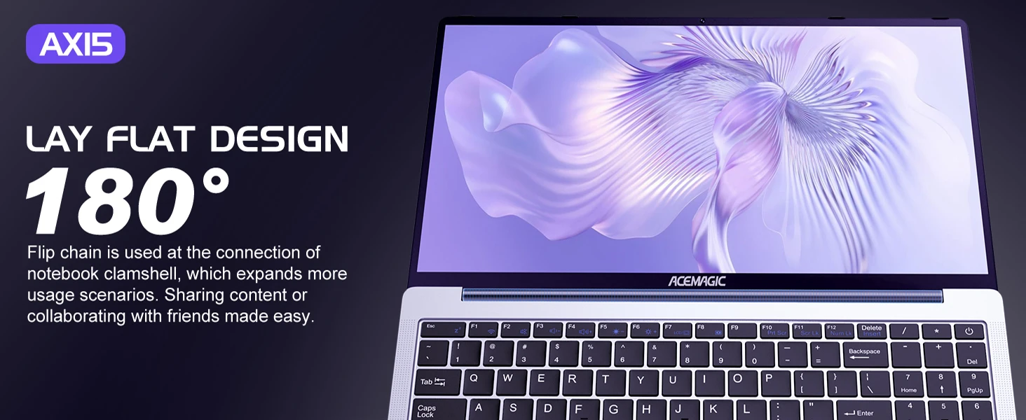 3. Lay flat design 180°: Flip chain is used at the connection of notebook clamshell, which expands more usage scenarios. Sharing content or collaborating with friends made easy
