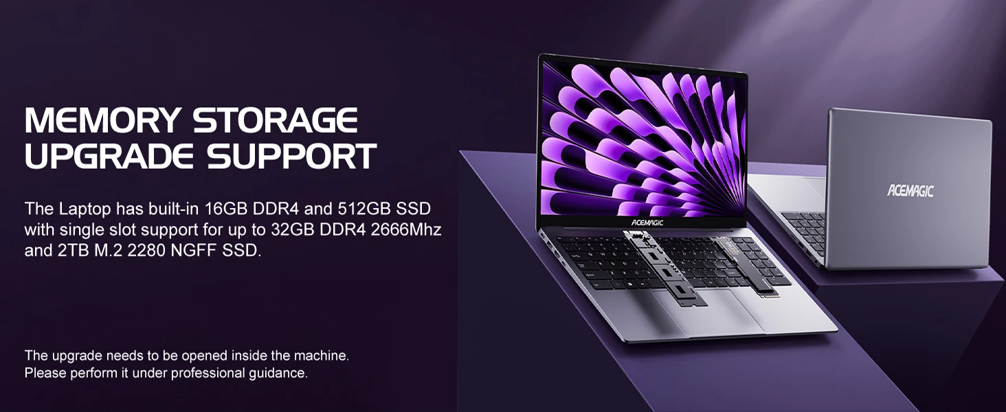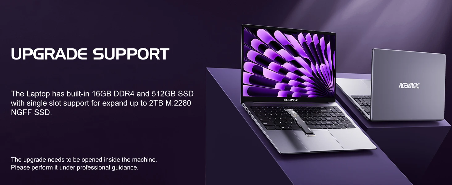 2. Memory storage upgrade support: Support expansion of 128GB TF card(not include), the Laptop has built-in 16GB DDR4 and 512GB SSD with single slot support for up to 32GB DDR4 2666Mhz and 2TB M.2 2280 SSD (The upgrade needs to be opened inside the machine Please perform it under professional guidance)